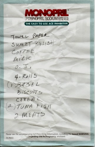 Here’s but one example recovered from a Kroger visit, if memory serves, in the early aughts. Recorded in pencil on a Monopril (Fosinopril Sodium) Easy-To-Use Ace Inhibitor scratch pad, the list reveals some 11 items this shopper sought, including towel paper (as opposed to paper towels), sweet relish and cereal. Other entries include “4 rolls,” although the naming convention proves inconsistent with other entries, such as “(1) Bagel” and “(2) Tuna Fish”.